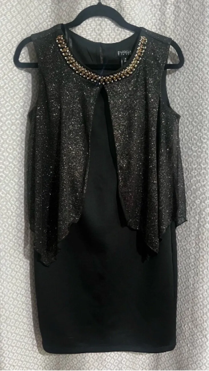 Size 4 Beautiful sheer cape loose cover completely covered in glitter and sparkleNeckline is lined in a beautiful sparkly rhinestone and silver metal detailSleeveless Bust: 16", Length: 35" ,Waist: 15.5", Hips: 17.5"