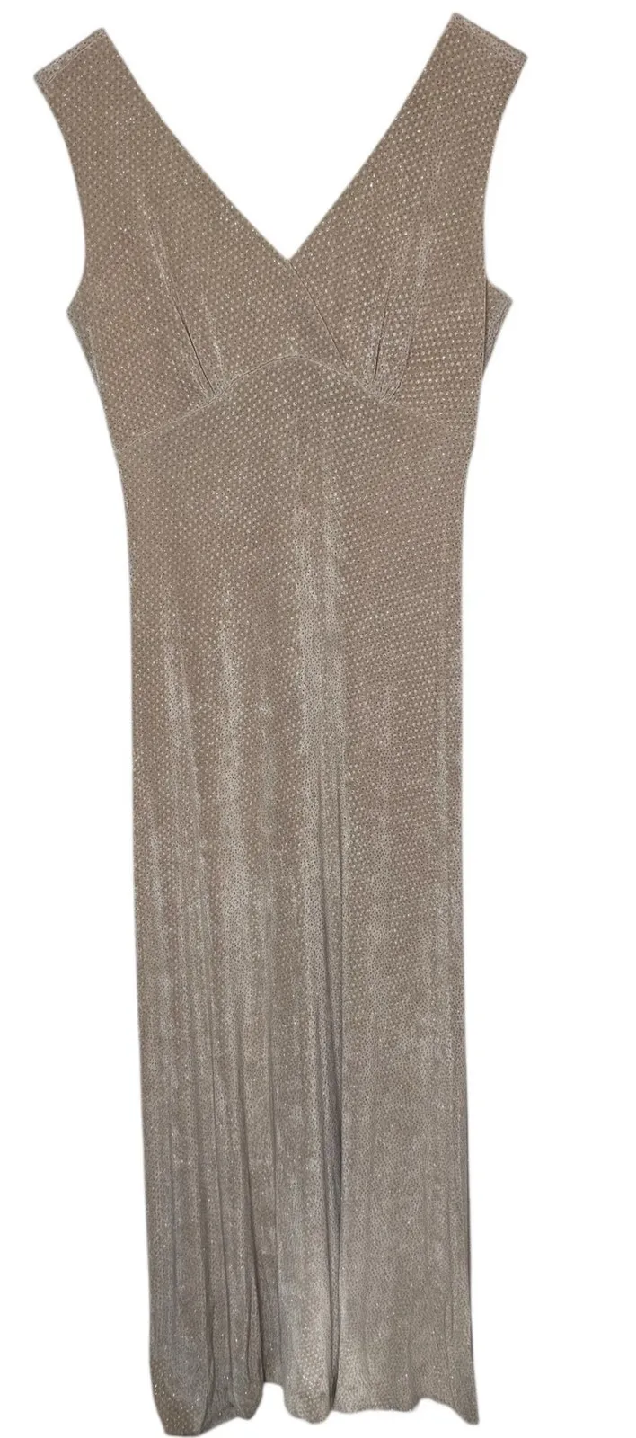 En Francais Huey Waltzer Maxi Dress Sparkle Jersey Knit Beige Vintage size 8 Condition: Excellent, no blemishes. Beige jersey knit fabric with silver sparkle detail all over Maxi length Sleeveless Double V neckline Darted bust A-line silhouette Back zip closure Measurements: 18in underarm to underarm 15in across waist 58.5in length wedding guest, formal, evening