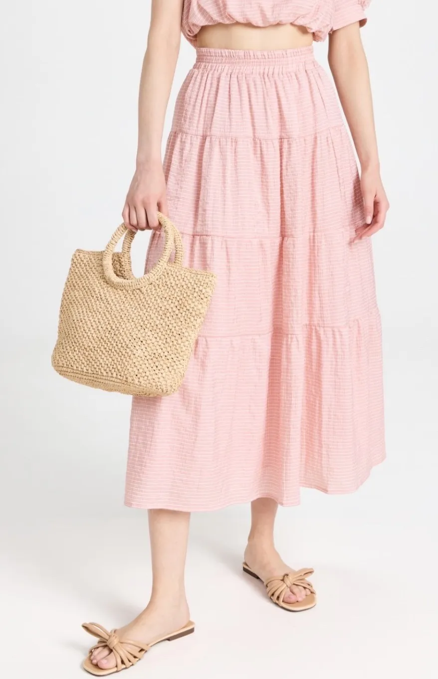 Float through your day in this charming En Saison tiered midi skirt. Delicate peach and white stripe... Show more