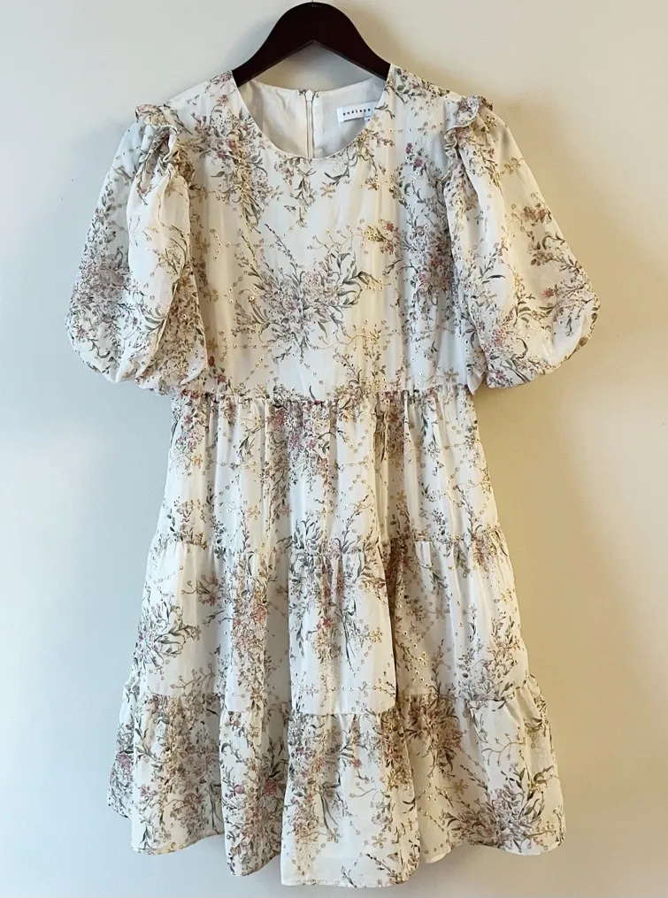 Excellent condition. White, gold metallic and pink floral print. Eyelet details. Embroidery. Round neck. Puff short sleeves. Tiered hem. Mini length. Back zip closure. Lined. Size Small Polyester, cotton Tags: designer, feminine, Anthropologie, formal, elegant, metallic, floral, cocktail hour, wedding guest dress, elegant, day party