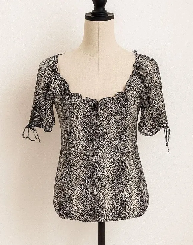 Energie Women’s Size S Snake Print Short Sleeve Tie Blouse Stylish Energie snake print blouse in neutral gray and white tones. Features short sleeves with tie details, ruffled edges, and a soft, stretchy fabric for a flattering fit. Feminine yet edgy, perfect for pairing with jeans or a skirt for day-to-night wear. No size tag, fits like a Small. Details: • Brand: Energie • Size: Small (fits like S) • Color: Gray and White • Pattern: Snake print • Style: Short sleeve with sleeve ties, ruffled trim • Condition: Great pre-owned condition Perfect for: Casual wear, going out, or layering with a jacket. #Energie #SnakePrint #AnimalPrintTop #ChicStyle #TrendyBlouse