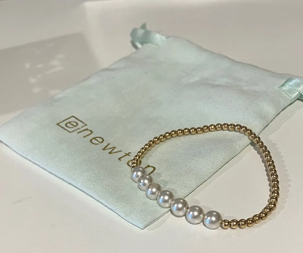 -Fair/good condition, has some wear on pearls as shown, but gold beads look great and not stretched out! With a stack, flaws are hardly noticeable. Comes with enewton bag. -Made with 2.5mm 14kt gold-filled beads and 6mm pearls Worry-free wear‚ which means sleep, shower and sweat in it Hand beaded on high performance elastic for a slight stretch to easily roll on and off your wrist Available in gemstone options Measures 6.25" Stacks well with all bracelets
