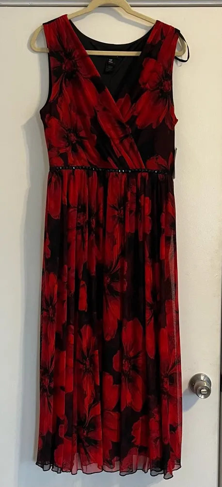 Gorgeous long dress with red and black floral design. Dress is sleeveless with a v neck wrap design with black beading under the bust. The top layer fabric is a sheer mesh, dress is lined. Women’s size 14 petite. See approximate measurements and compare to your favorite dress to determine fit. Length 51 inches Beaded waistline 15.75 inches flat Could be midi or maxi depending on height. Tank top. Brand new with tag.