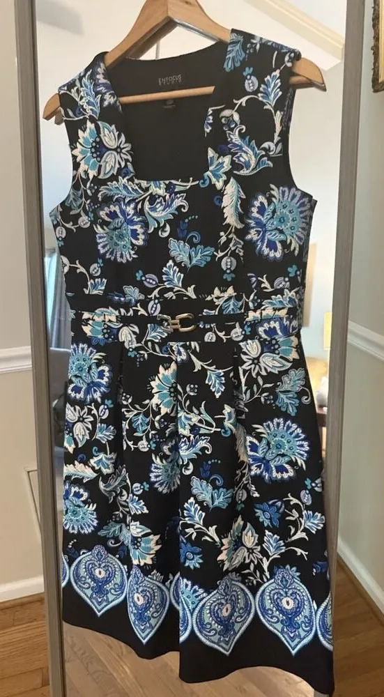17 bust / 40 length The En Focus Studios dress is a beautiful navy blue floral fit and flare dress perfect for any occasion. This sleeveless dress features a flattering knee-length silhouette, making it a versatile piece for parties, cocktails, or casual outings. The floral pattern and shift style add a touch of femininity and charm, while the comfortable size 10 ensures a perfect fit for the modern woman. Perfect for any season, this dress is a stylish choice for a chic and trendy look.