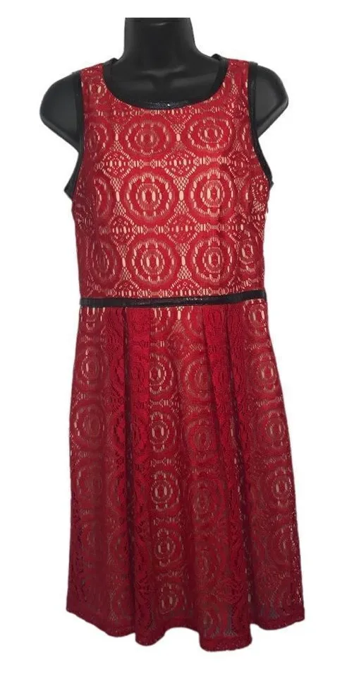 Red Lace Dress with black faux leather accents and zipper on side. There are a few little snags, you can see them in the pictures. In good, pre-loved condition. Comes from a smoke free home.