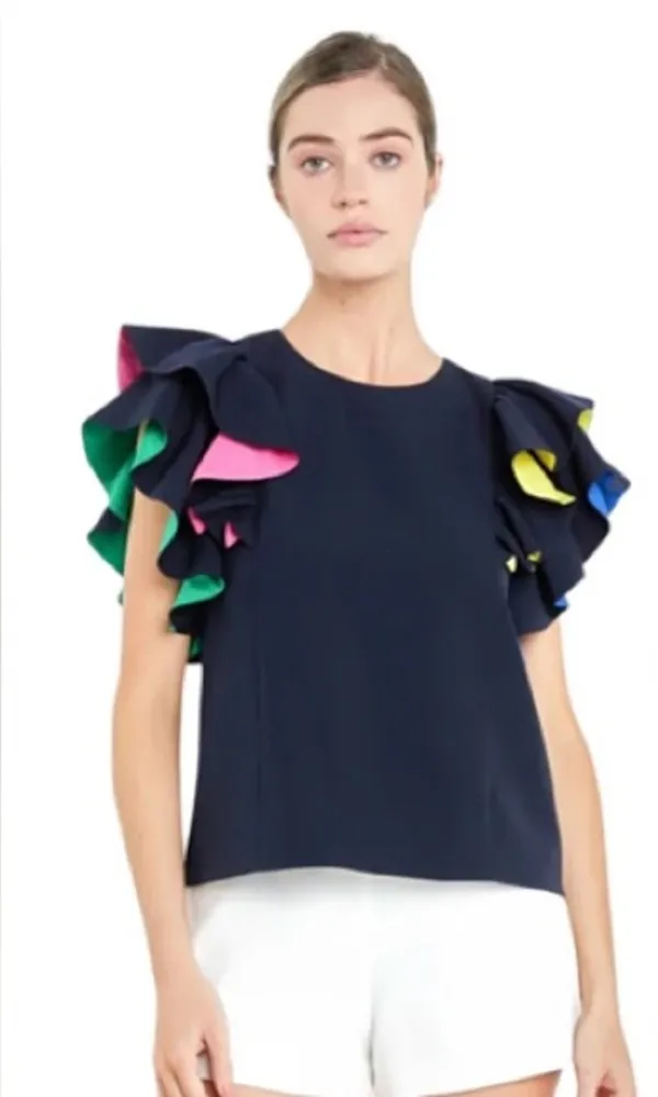 English Factory Navy blue/ colorful ruffle sleeve blouse top, size XS, MSRP $95 Blue - $35 - From Maria