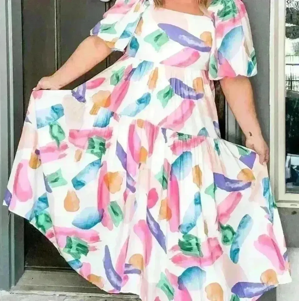 Boutique Summer Splash by entry I, watercolor, lined to the knee, maxi dress with puff sleeves, squa... Show more
