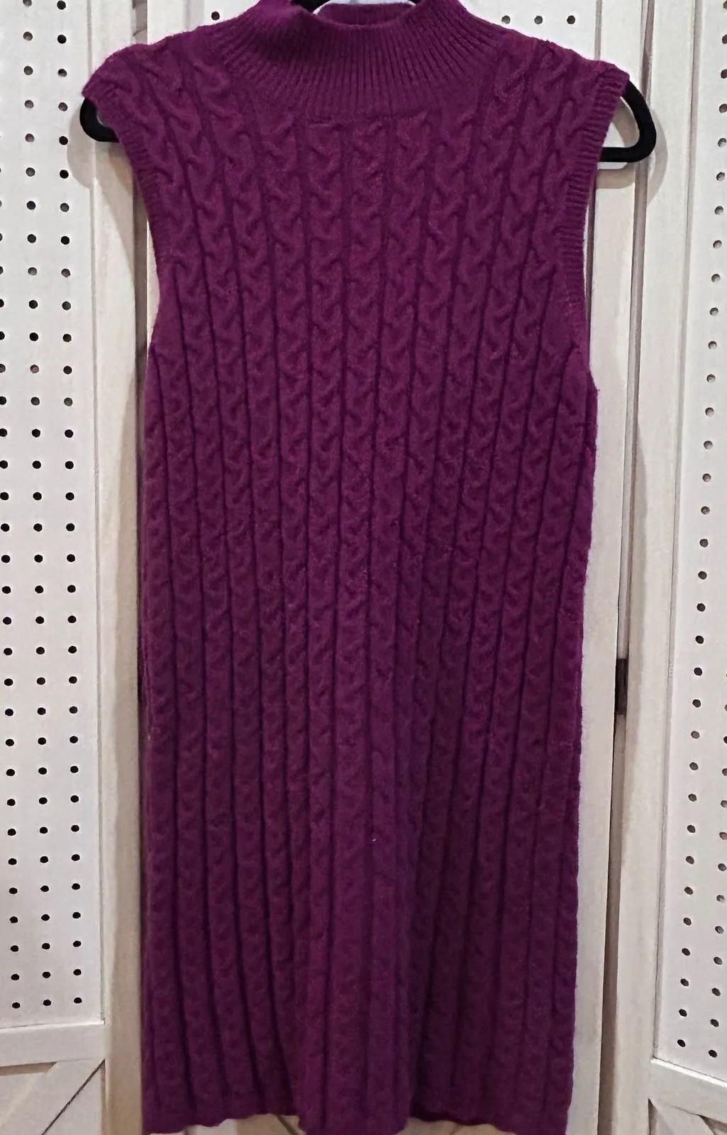 Like new cable knit sweater dress in a rich purple hue. This sleeveless dress features a classic moc... Show more