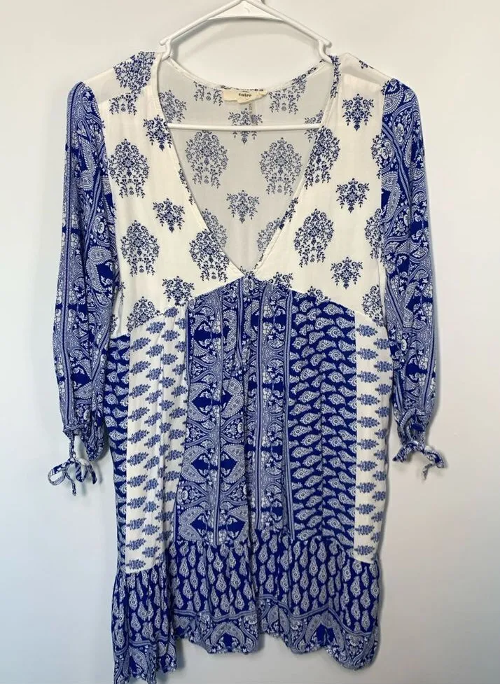 Entro Damask Tapestry V-Neck Babydoll Mini Dress Blue & White Small Brand: Entro Department: Wome... Show more