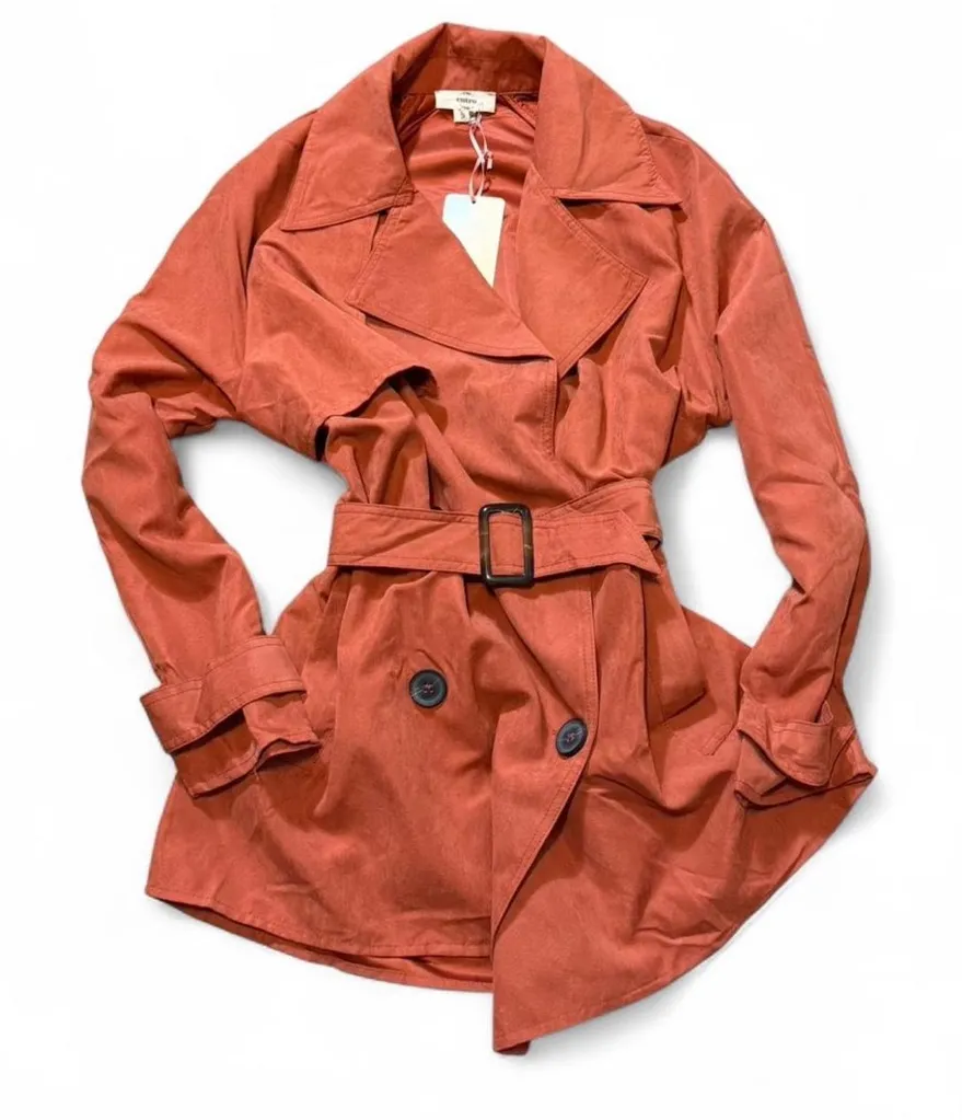Faux Suede Double Breasted Trench Coat. Classic jacket in beautiful burnt orange color. Adjustable b... Show more