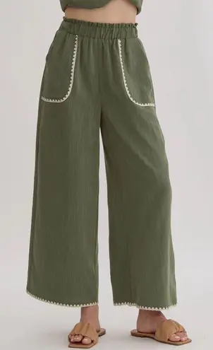Entro Large Olive Green High Waist Scallop Trim Embroidered Wide Leg Pants NWT - $39 New With Tags - From Satara