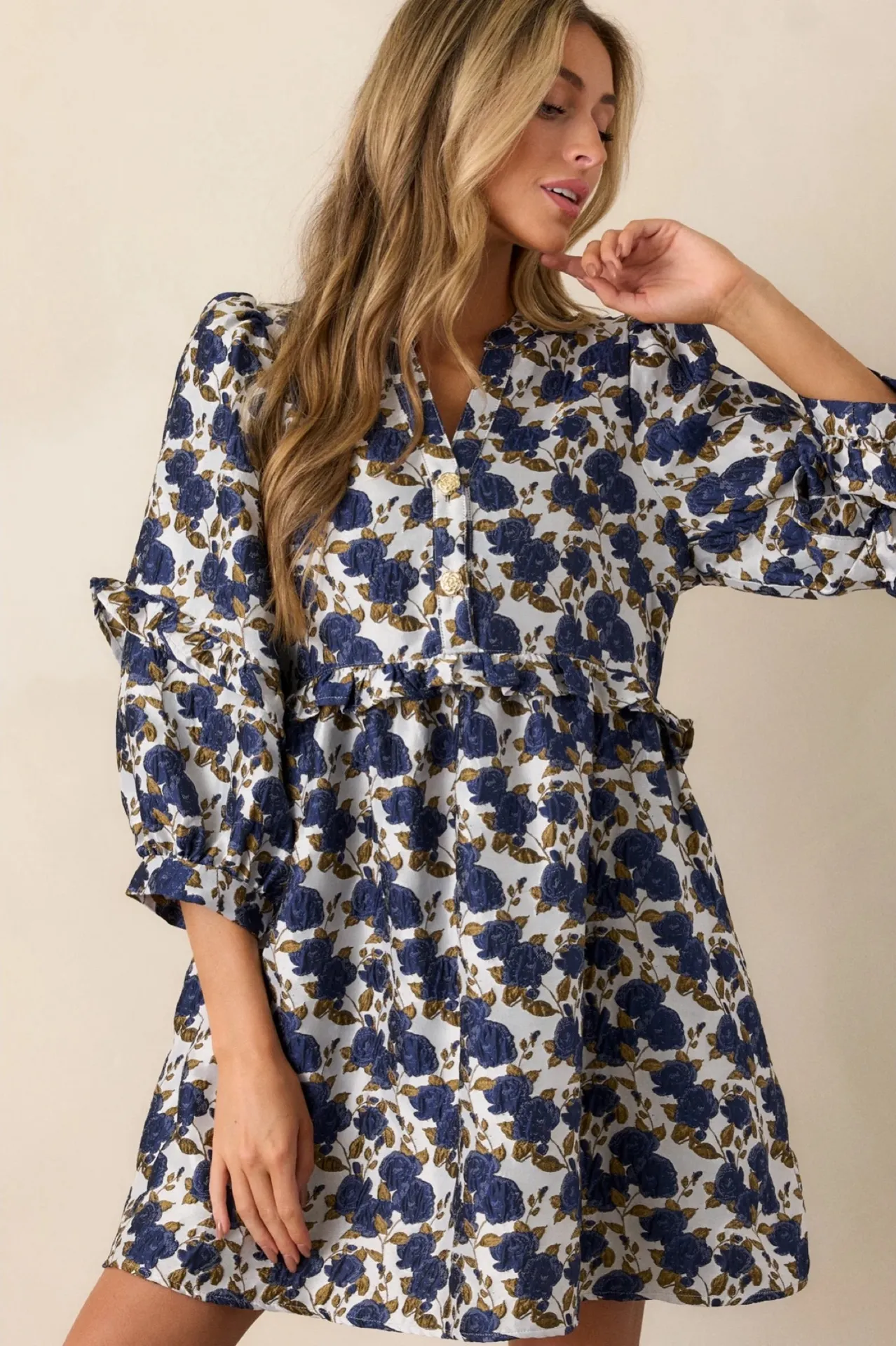 Style Name: Entro Gracie Floral Dress Print: Navy floral Features: Textured jacquard fabric, ruffled... Show more