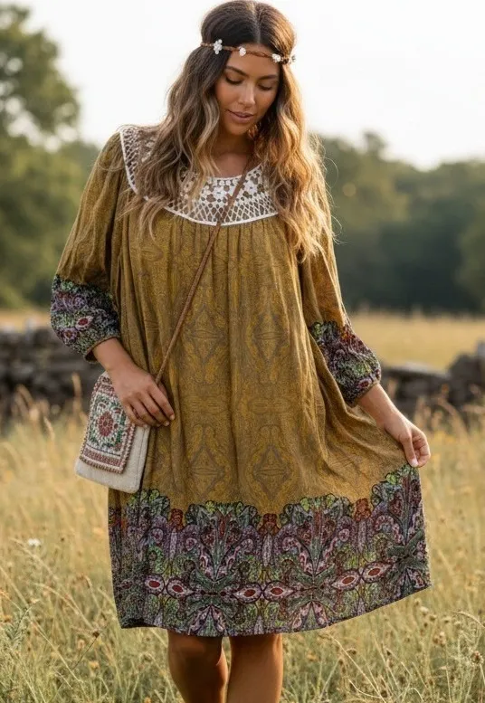 Crochet lace yoke Keyhole back Knee length Scoop neckline Woven rayon fabric Fully lined Relaxed bab... Show more