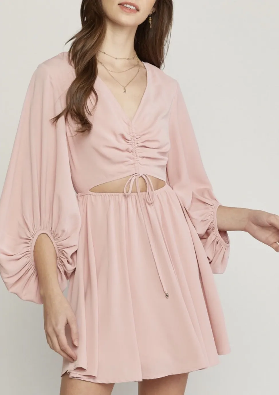 Keywords: pink mini dress, ruched dress, cutout dress, long sleeve dress, v neck dress, bishop sleeve dress, cinched waist dress, flowy dress, party dress, evening dress, cocktail dress, summer dress, spring dress, feminine dress, romantic dress