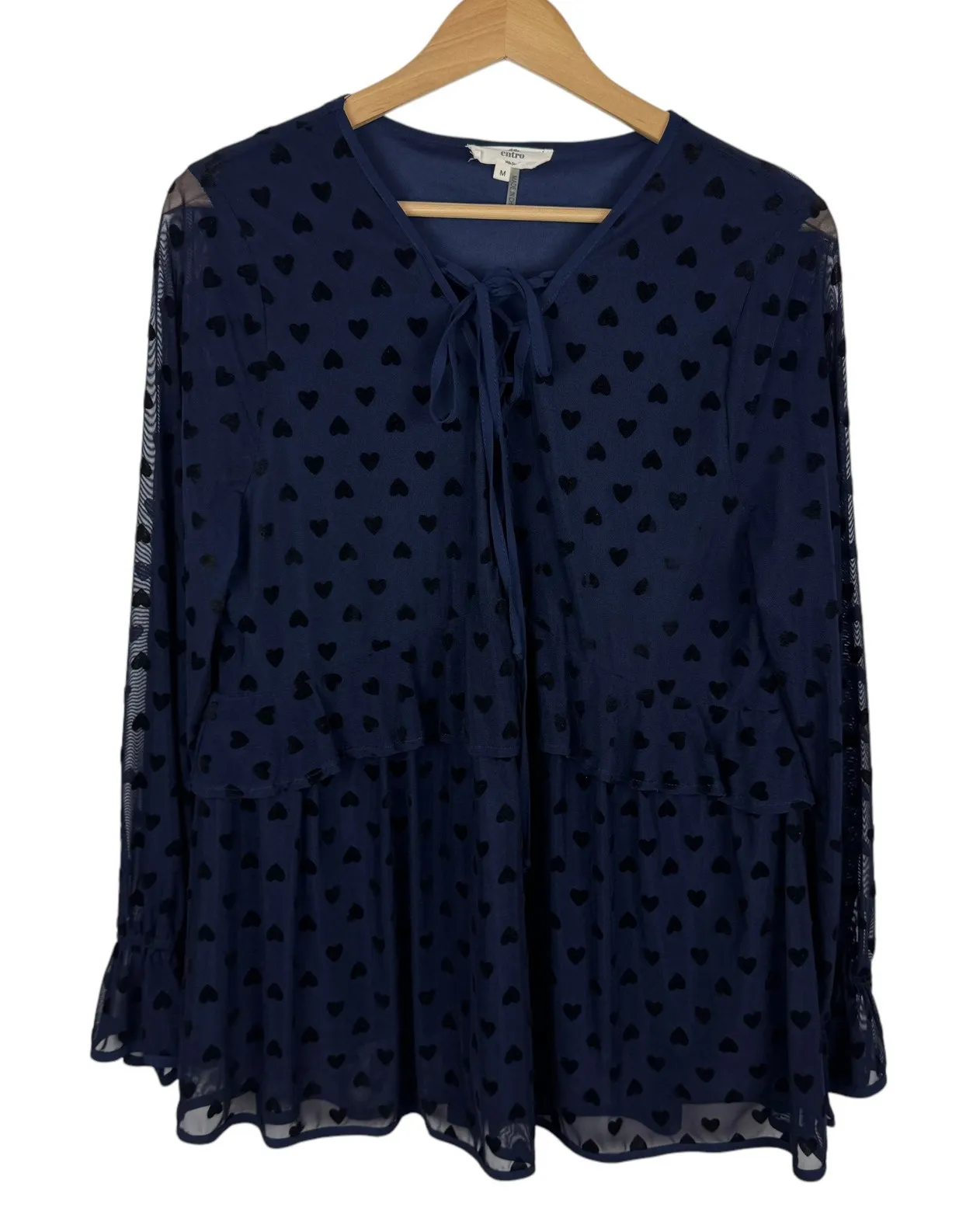 Keywords: heart print blouse, sheer top, long sleeve blouse, ruffle top, tiered blouse, navy blue blouse, black heart print, v-neck blouse, casual blouse, party top, womens top, entro blouse, flocked heart, romantic blouse, boho blouse