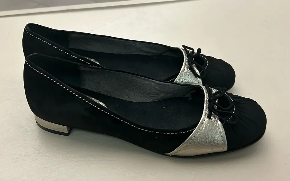 Elevate your wardrobe with these chic black and silver flats. Designed for comfort and style, they are perfect for any occasion. Preowned with some wear mostly inside shoe! Many miles left but will price accordingly