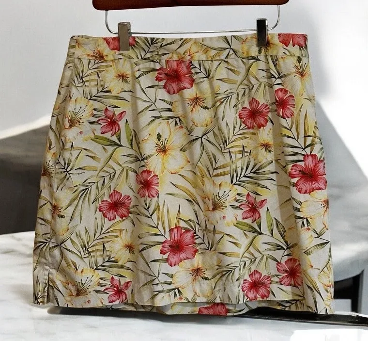 A vibrant tropical floral print A-line mini skort. This eye-catching skort showcases a lively pattern with bold red hibiscus flowers interspersed with yellow blossoms and lush green foliage on a light background. A secure zipper closure and a button at the waistband ensure a comfortable fit. Measurements: • Waist: 21 1/4 inches • Hip: 18 3/4 inches • Length: 16 inches • Hem Width: 24 3/4 inches • Side Length: 19 inches This item is in good preowned condition. It comes from a non-smoking, pet-free home. • Kindly review all photos carefully before purchasing. • Quick Shipping ! Same or Next Day! • Fabric tags shown in photos If still attached • All measurements are take unstretched and are APPROXIMATE