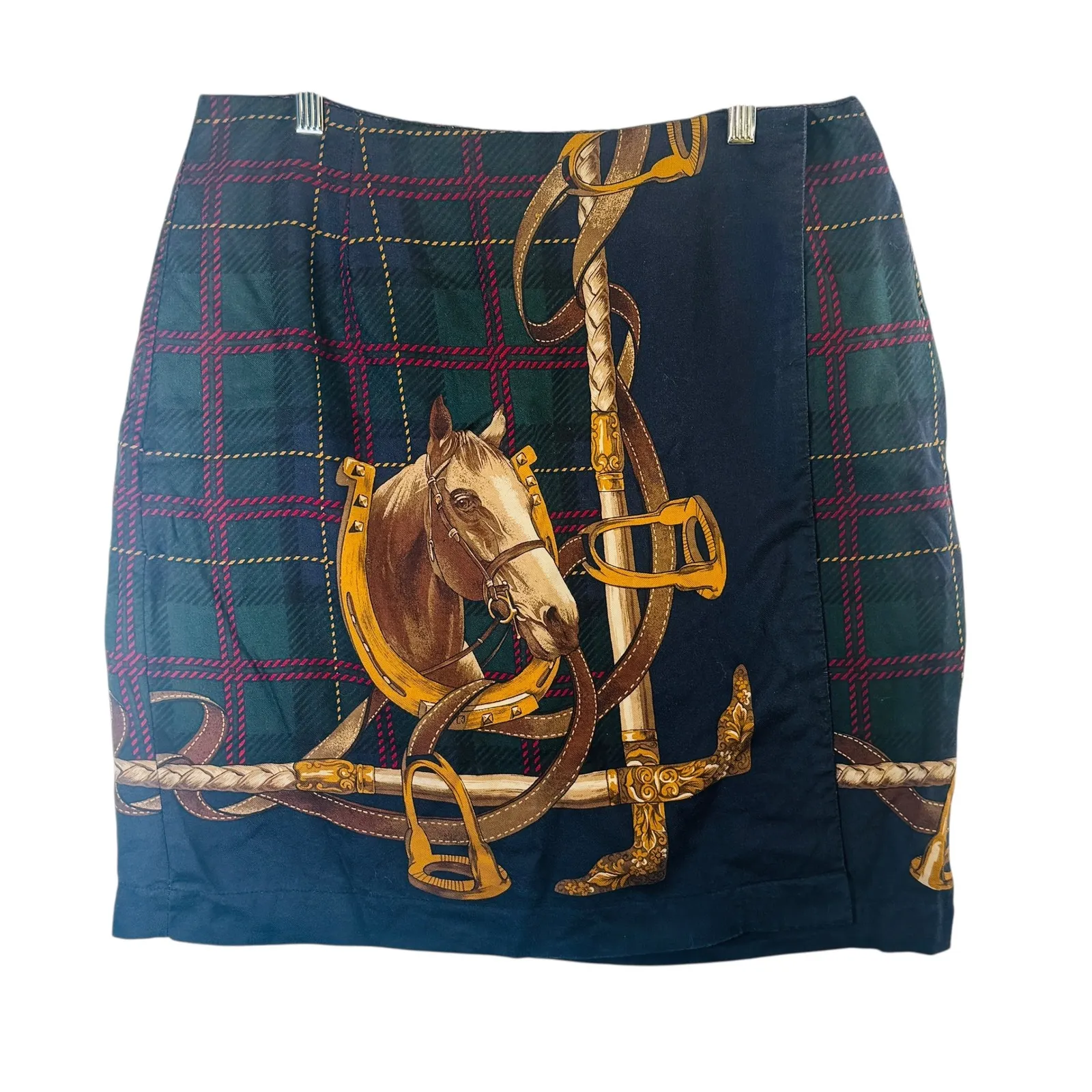 Handmade equestrian-print skirt featuring a rich tartan base with classic riding-themed artwork—hors... Show more