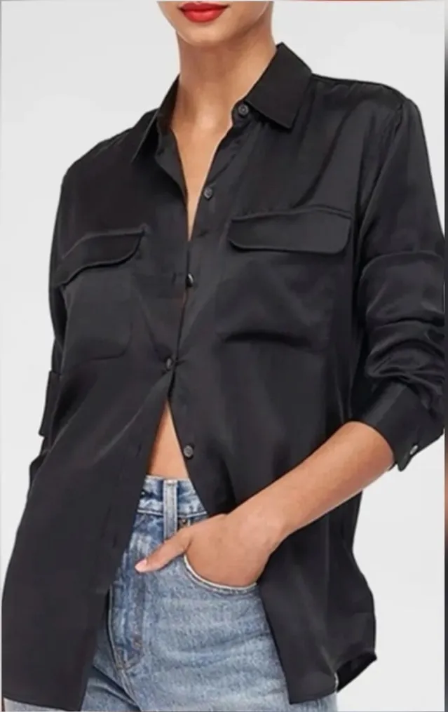 Women’s size small Equipment button down satin blouse in black. Long sleeves, two front pockets. Excellent condition! Approximate flat lay measurements: Pit to pit: 22in Neck to bottom: 27.5in #minimalist #office #career #staple #academia