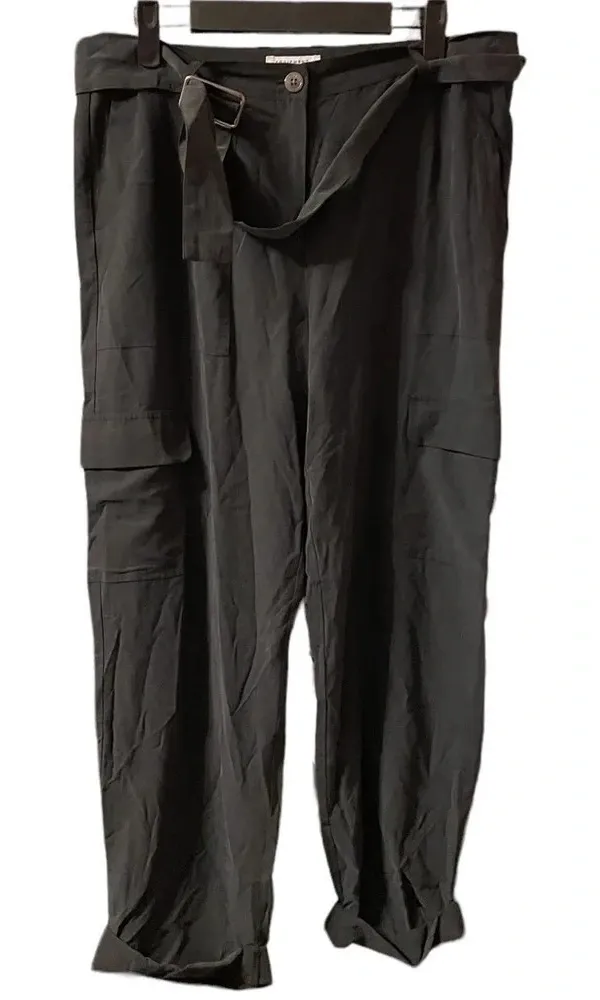 Pre owned please note these are flawed. There are two holes on the inside left leg so they do need some repair. Otherwise they’re perfect. Easy fix since they’re inside legs and hard to see. 100% silk belted cropped cargo pants. Womens size small.