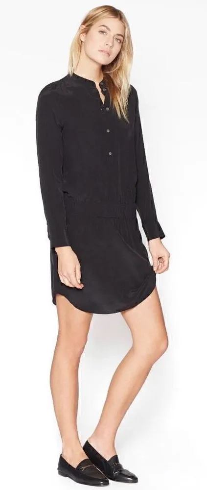 Equipment Femme Long Sleeve Drop Waist Dress in Black Size Medium. In excellent used condition. This classic elegant dress features a button front closure, a mandarin style neckline, long sleeves with buttoned cuffs, an elastic waistband & a rounded hemline. It is a relaxed fit/silhouette. It would pair perfectly with loafers/flats as shown. Only tried on, it fit a little looser than I anticipated. From a smoke free, pet friendly home.