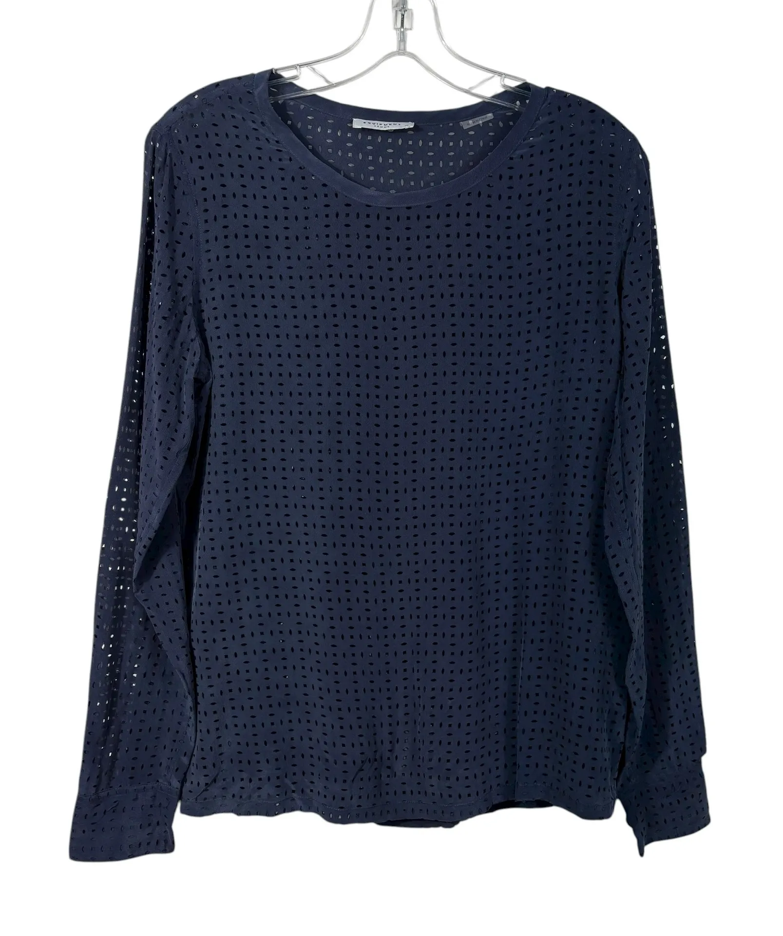 In good condition! Dark navy blue color in a lightweight 100% silk material. Long sleeves with a rounded neckline. Perforated hole detail throughout. Relaxed fit. Gently used. No rips, stains, or holes! Size XS. Pit to Pit: 19in Shoulder to Hem: 24in