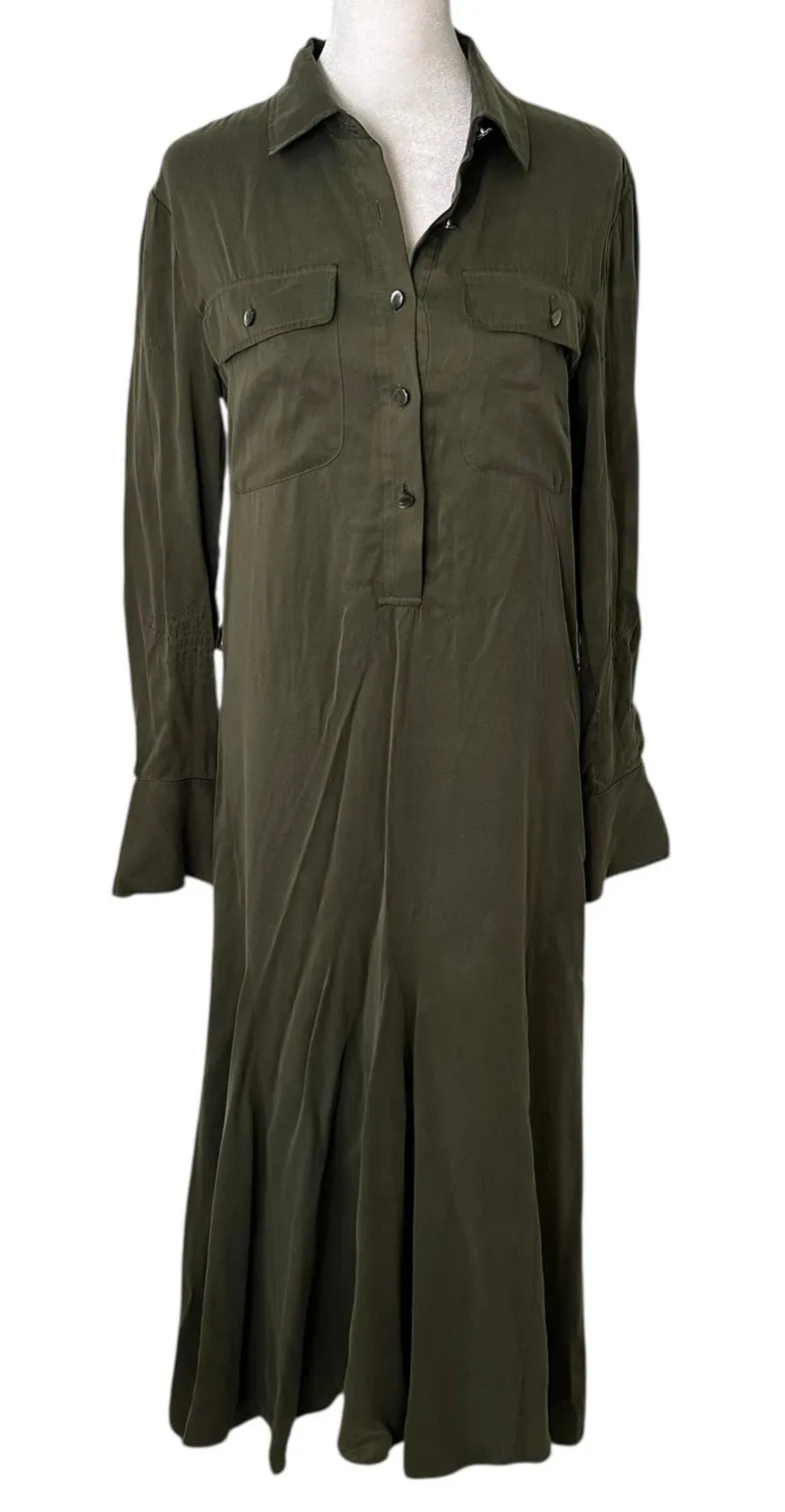 See all pics - there's some impressions / flaws on the right sleeve Brand - Equipment Size - x-small Material - silk, viscose - moss green color - midi length - half button down front - shirt dress - three-quarter length sleeves - casual or business casual, classic Measurements available upon request I consider reasonable offers! Check out my closet for additional bundle discounts