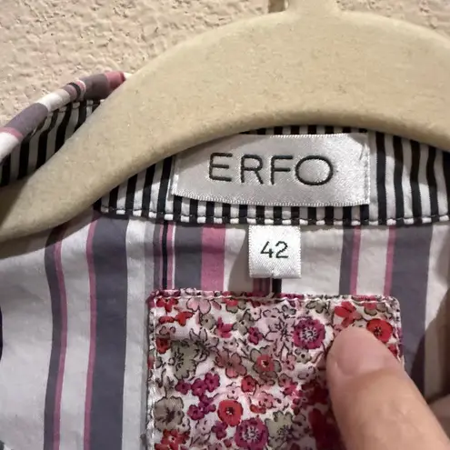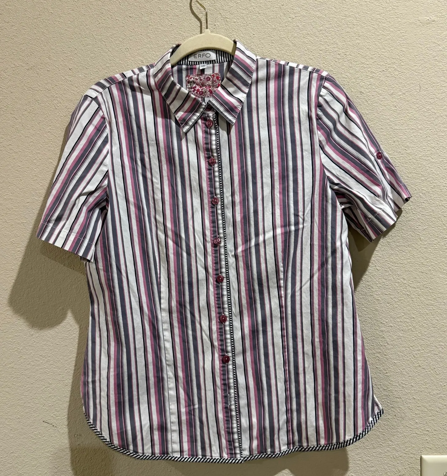 A women's short sleeve button-up shirt from ERFO. This stylish top features a classic collar and a button-down front with decorative pink buttons. The shirt is adorned with a vertical stripe pattern in white, pink, and gray. Distinctive detailing includes contrast stitching along the placket and a floral print pocket accent. The sleeves are short and feature roll-tab details. The hemline is subtly curved with a striped trim. Measurements: • Chest (pit to pit): 20 inches • Length (shoulder to hem): 25 inches Keywords: ERFO shirt, women's button up, short sleeve shirt, striped blouse, pink and gray stripes, size 42 shirt, casual top, work shirt, button front shirt, floral accent, classic collar, womenswear, fashionable shirt, summer blouse, designer shirt • All items come from a pet-friendly, smoke-free home. • Please compare the measurements to something you already own.
