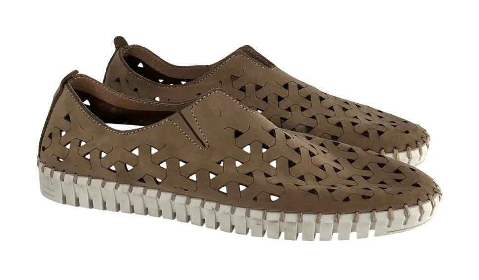 • Slip-on style with a flexible fit • Perforated nubuck leather upper for breathability • Durable white rubber sole • Lightweight and comfortable design Light wear on soles, overall excellent condition.