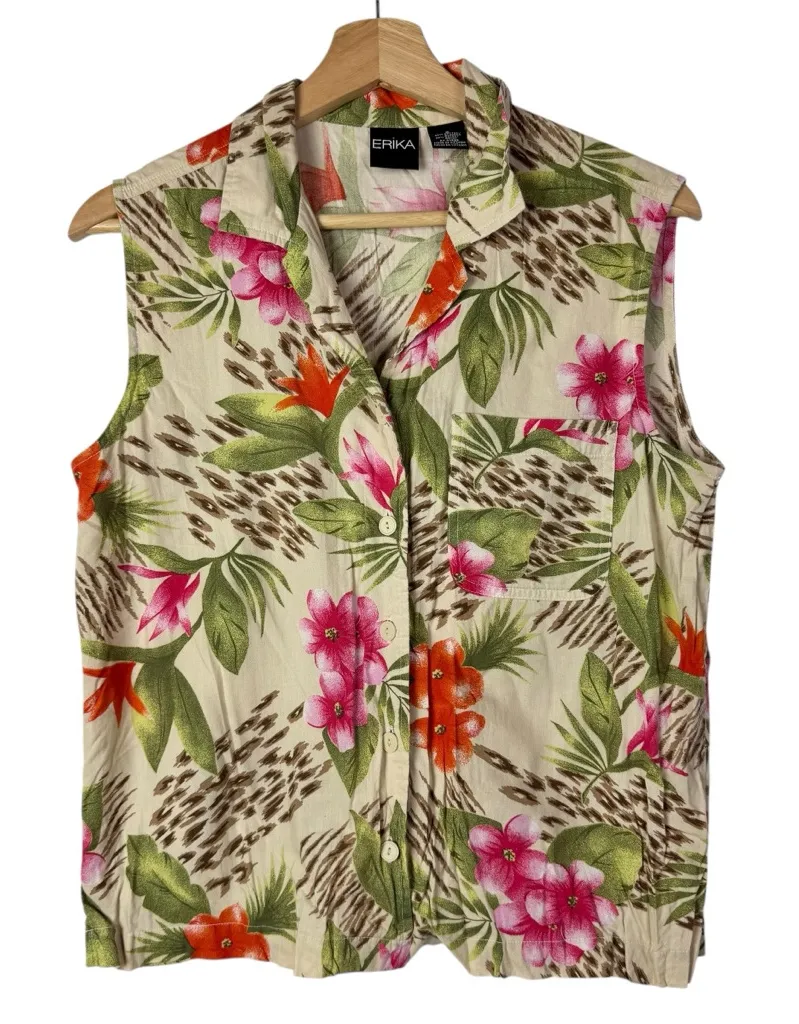 Erika Beige Tropical Pink & Green Floral Button Down Tank Top Good used condition, minimal signs of wear. - Collar neckline - Sleeveless fit - Beige backing - Green & red tropical floral - Full button up front - Y2K vintage style - 55% cotton 45% rayon All items ship from a smoke & pet free environment. All orders ship same or next business day.