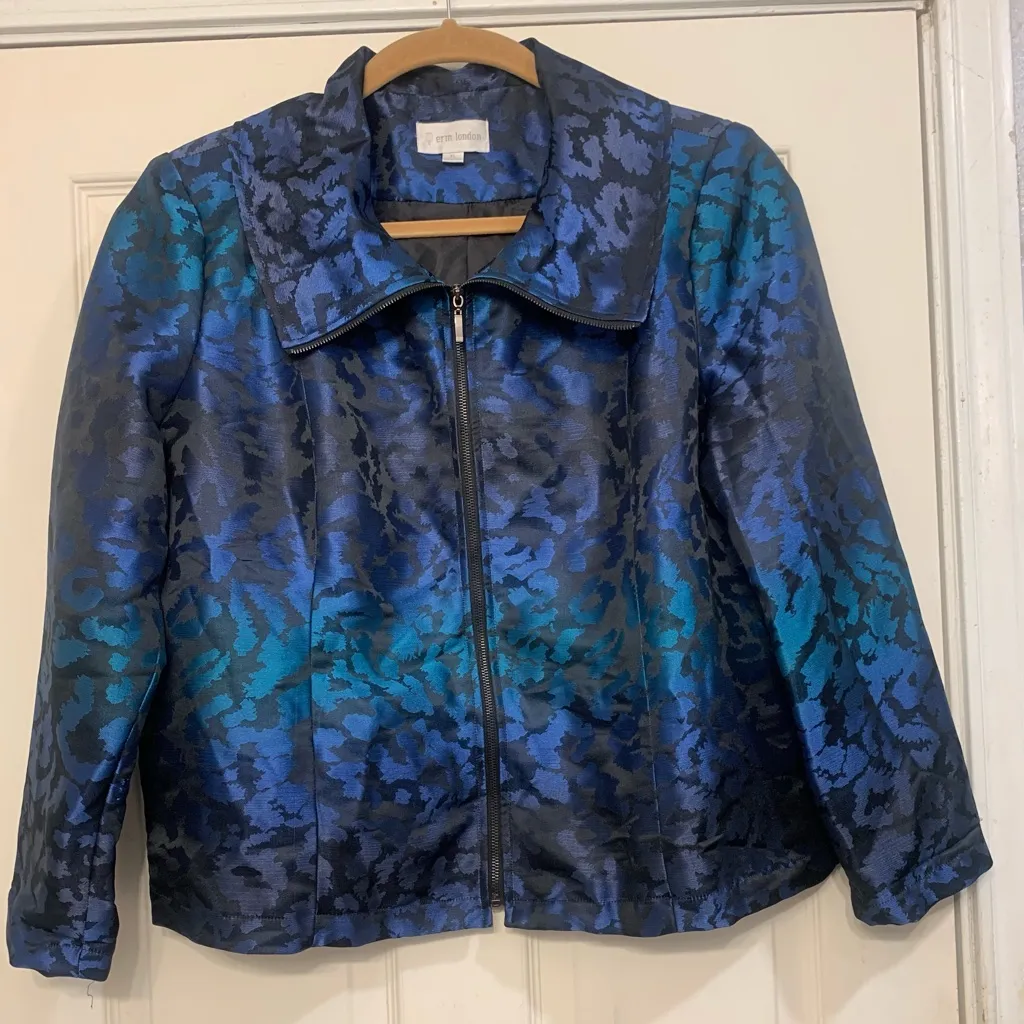 Erin London Light Weight Full Zip Black Jacket. Purple, Aqua, and blue print. Shimmering effect. Larger collar. Full front zipper closure. Shoulder pads. Black liner. In great condition. Size: xl Measurements: 27” armpit-armpit 15.5” armpit-hem 26” sleeve #shimmer #cheetah #glam Please note measurements are with item laid flat. This elegant women's jacket features a striking blue pattern, perfect for adding a touch of sophistication to any outfit. Ideal for both casual and formal occasions.