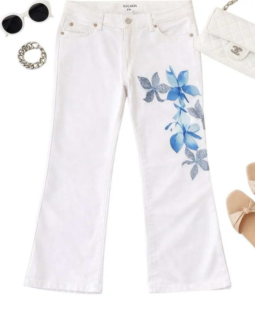 Escada designer white jeans crafted in Italy, featuring a refined blue floral motif accented with su... Show more