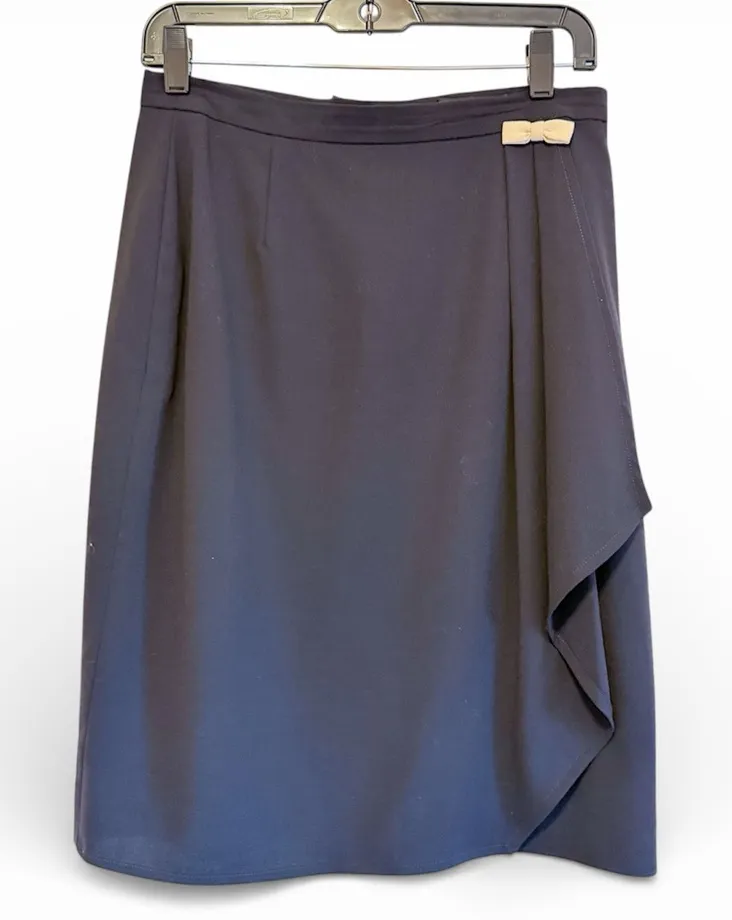 Color: Black with cream color bow 100% Virgin Wool 100% Rayon lining Highwaisted Back zipper and buttons Side pleats detail/half front wrap and cute contrasting bow Approx. kneelength Pencil skirt style No stretch in the fabric Spare button at tag Very unique and retro! Preloved and in excellent condition, clean and steam sanitized. Please see pictures of aproximate measurements laid flat and fabric/care details. Smoke/Pet free home, ships ASAP! Bin 9