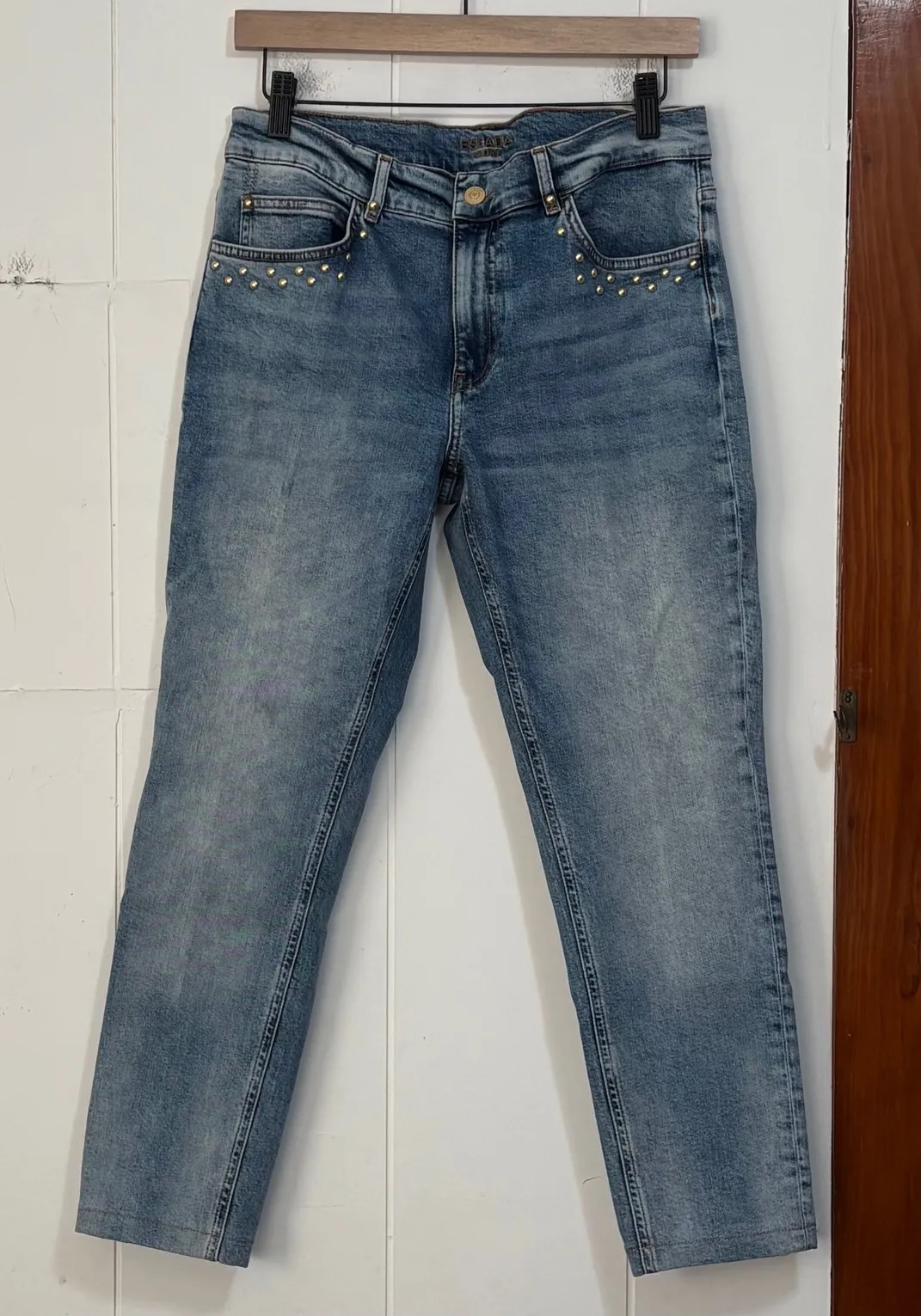Blue denim jeans from ESCADA SPORT. These jeans feature a light wash with subtle distressing and decorative stud accents on the front pockets. The classic five-pocket design and a comfortable straight leg make them a versatile addition to any wardrobe. Perfect for casual outings or a relaxed weekend ensemble. Measurements: • Waist: 30 in • Hip: 40 in • Rise: 10 in • Inseam: 26 in (has been professionally hemmed) • Leg Opening: 7 in Style: Straight Department: Women Fabric Wash: Light Waist Size: 31 in Type: Jeans Accents: Studded Features: Pockets, Distressed Fit: Regular Pattern: Solid Rise: Mid Fabric Type: Denim Material: Cotton, Polyester, Spandex Closure: Zip, Button Product Line: Escada Sport Season: Spring, Summer, Fall Keywords: ESCADA, denim, straight leg, studs, light wash, designer jeans, womenswear, casual, weekend wear, everyday, fashionable, comfortable
