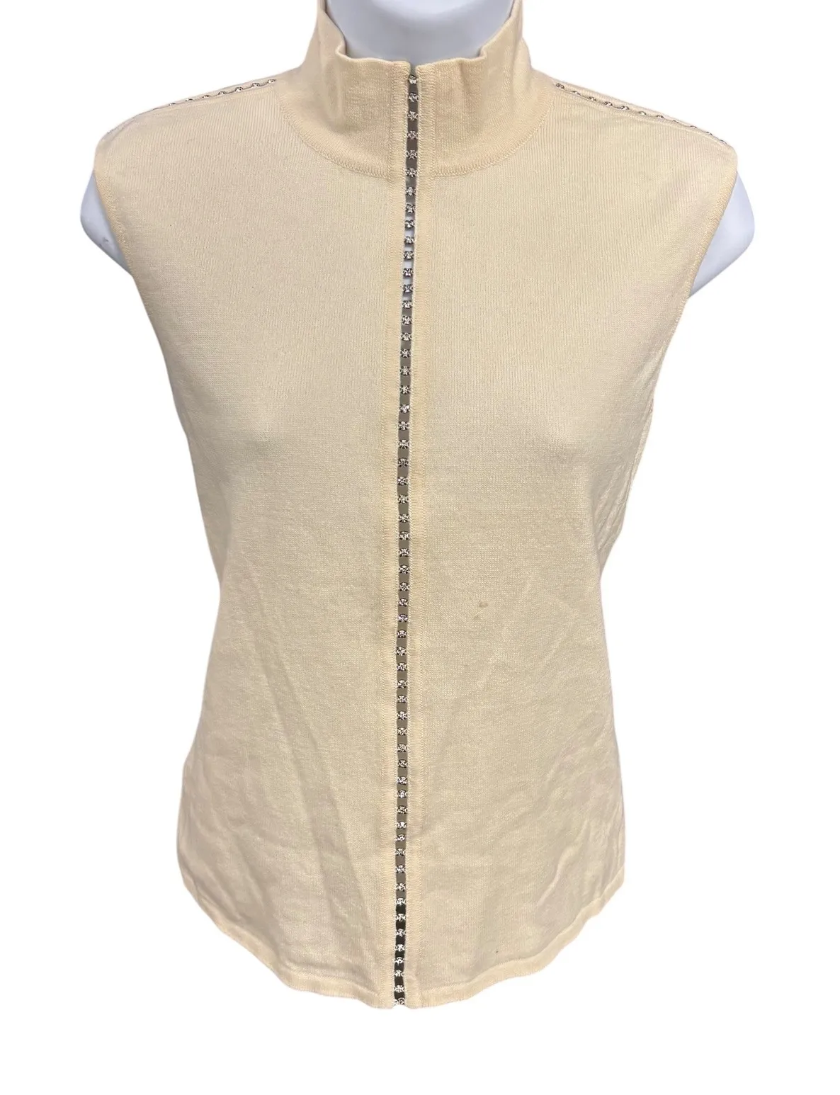 An elegant beige sleeveless mock neck sweater vest by Escada. This stylish vest features a full-length rhinestones down the front adding a touch of glamour. Additional rhinestone detailing accents the shoulders. The back of the vest is plain, with three mother-of-pearl buttons at the neckline closure. **There is a small stain noted on the front of the garment.** Outer Shell Material: Knit Blend Department: Women Theme: Designer, Luxury Accents: Rhinestone, Button Features: Mock Neck Fabric Type: Knit Pattern: Solid Season: Spring, Fall Closure: Button Occasion: Casual, Workwear, Party/Cocktail Keywords: Escada sweater vest, Women's sleeveless sweater, Mock neck sweater vest, Rhinestone embellished top, Designer knit vest, Beige sweater vest, Size 36 vest, Luxury fashion, Elegant top, Evening wear, Statement vest, Chic apparel, Fashionable knitwear