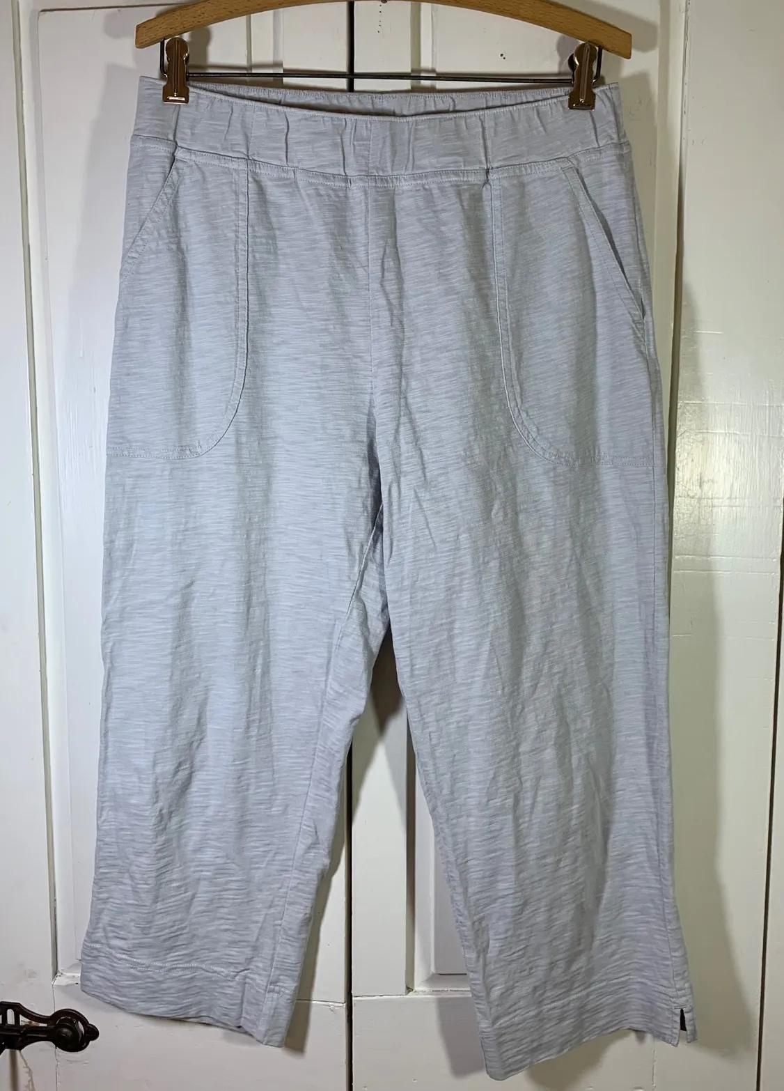 Escape by Habitat Clothes women's crop pants in a light blue textured fabric. These comfortable pants feature a pull-on style with an elastic waistband and functional side pockets. The cropped length and subtle textured pattern make them a versatile addition to your casual wardrobe. Perfect for everyday wear, weekend errands, or a relaxed day out. Style: Cropped Department: Women Material: Cotton Leg Style: Tapered Type: Pants Fabric Type: Knit Features: Pockets, Elastic Waist, Crop, Comfort, Stretch Closure: Pull On Pattern: Solid Occasion: Casual Fit: Relaxed Front Type: Flat Front Season: Spring, Summer, Fall Keywords: cropped pants, pull on pants, textured fabric, elastic waist, casual pants, everyday wear, weekend style, comfortable pants, light blue pants, cotton blend, Capri pants, lounge pants