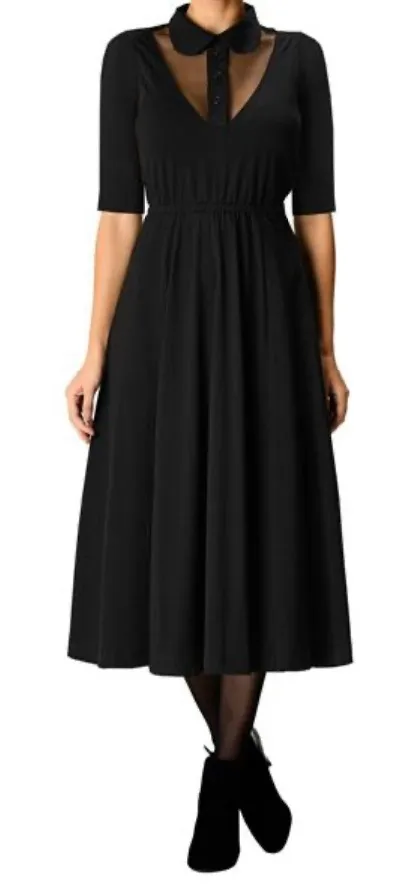 Slips on over head; partial side zip closure. Short front button closure. Bodice darts to shape. Elastic seamed waist. Full flare skirt. Side seam pockets. Sheer tulle panel at neckline Half sleeve 95% cotton/5% spandex, jersey knit, light structured feel, light stretch, midweight Size - XL (18) Color - black Condition - very good preowned condition with minor wear Length 46” Pit to pit 21” Waist 32” elastic and stretchy Z024