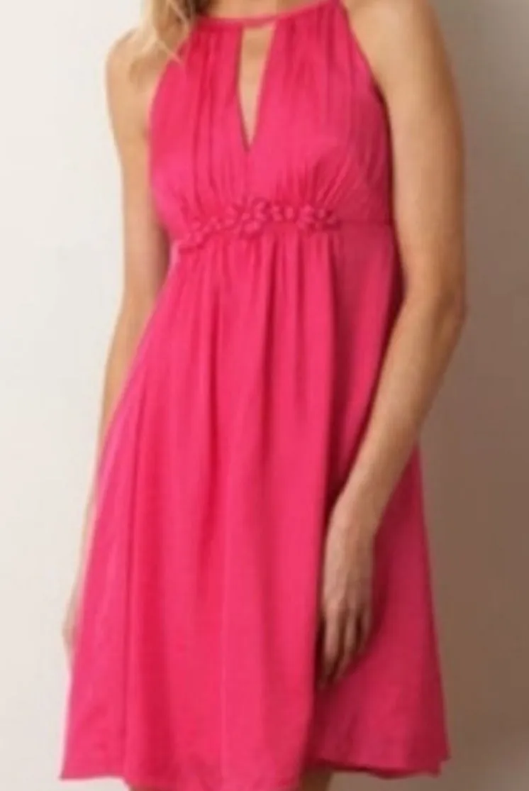 A vibrant pink dress, perfect for adding a pop of color to your wardrobe. This charming piece features a halter neckline that accentuates the shoulders and a fitted bodice with delicate floral detailing at the waist. The dress flows into an A-line silhouette, offering a flattering shape that complements various body types. Crafted from a blend of cotton and silk, this sleeveless dress combines comfort with a touch of luxury, making it ideal for warm weather events or casual outings. The back features a button closure, ensuring a secure and seamless fit, while the inner lining enhances the dress's structure and ensures modesty. Keywords: Esley dress, pink halter dress, floral dress, sleeveless dress, cotton silk dress, aline dress, summer dress, cocktail dress, party dress, medium dress, women's fashion, casual dress, vacation dress I love making deals! Please send offers through the button. Smoke free dog loving home