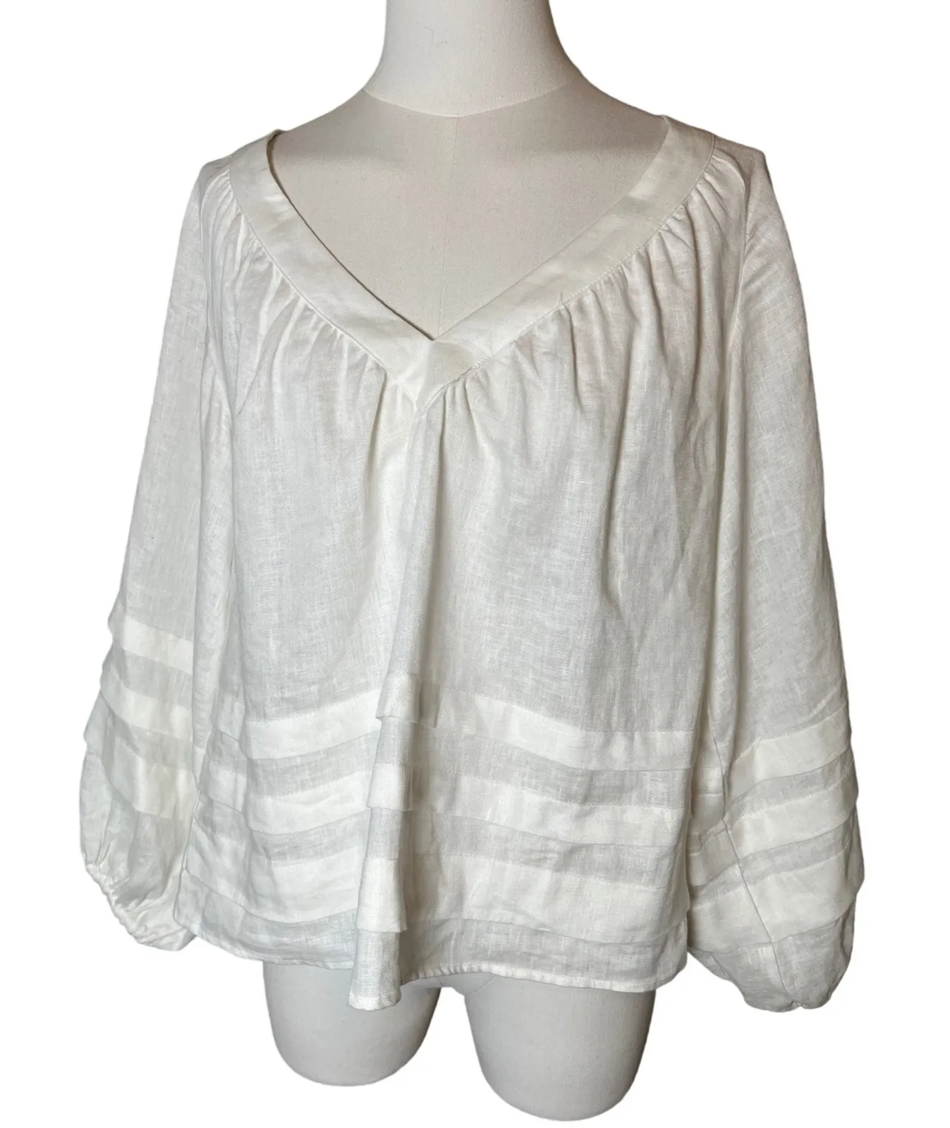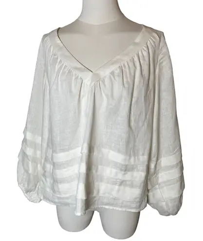 Light and airy, this 100% linen blouse from Australian label Esmaee blends refined craftsmanship with an effortless silhouette. The "Glow Blouse" features balloon sleeves with decorative tuck design on lower sleeves and blouse, an elegant V-neckline, and a relaxed drape that moves beautifully. Perfect for layering over denim or linen trousers for an easy coastal-inspired look. Condition: Excellent Measurements (flat): Approx. 19" pit to pit • 22" length Material: 100% Linen • Made in PRC Stylecore Vibes: Coastal Grandma • Minimalist Luxe • Boho Resort • Cottagecore •Natural Esmaee Glow Blouse white linen peasant top, balloon sleeve relaxed fit, coastal grandma minimalist resort wear, cottagecore linen blouse XS, quiet luxury natural fiber top