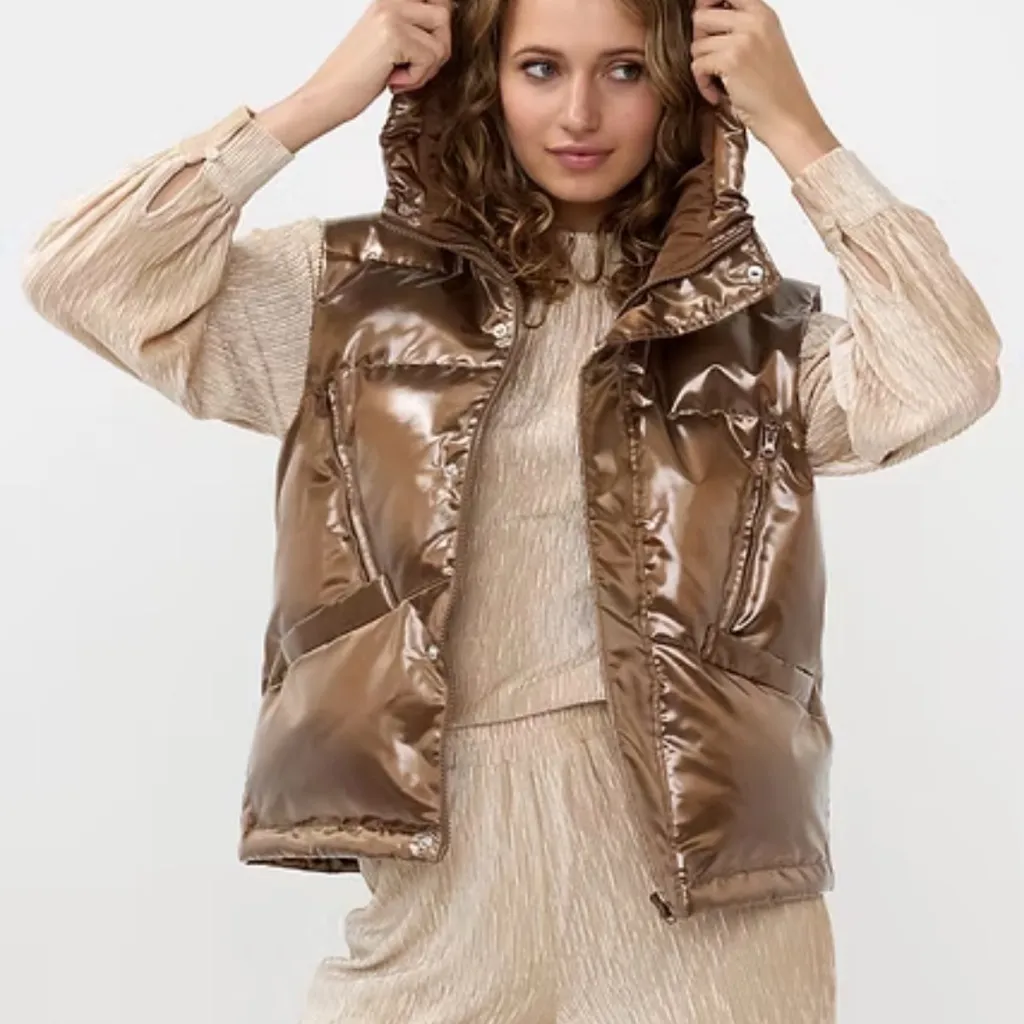 Esqualo womens sleeveless body-warmer hooded metallic puffer vest Size 4 New with tags - mint Retails $125 Sold Out Color - Brandy Full zip closure w/Snaps Zip Pockets Bust 22.5” Length 22” Smoke free home Shipping within 24 hours (excluding weekends and weather)