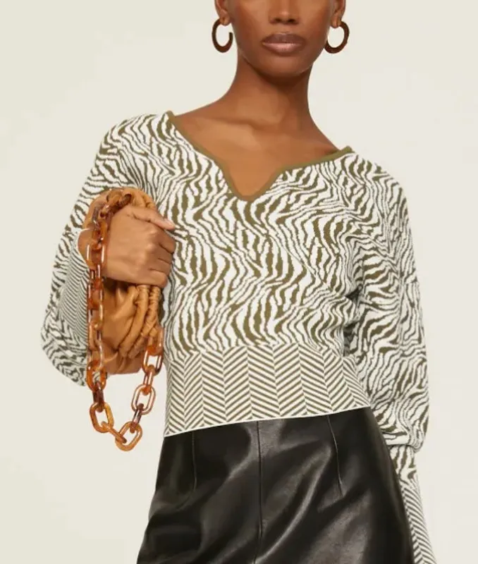 Unique designer sweater features zebra animal print, pullover closure, v-neckline, long mutton dolm... Show more