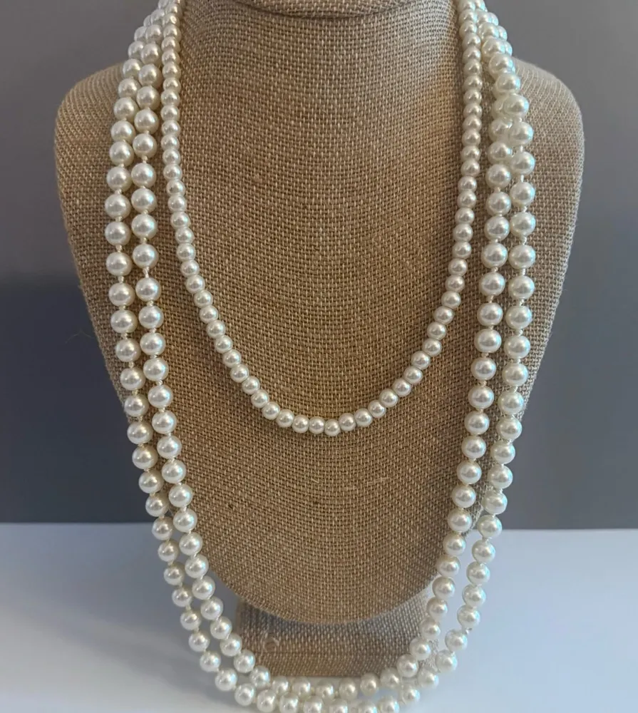 Estate faux white pearl necklaces, one measuring 58 inches long and the other 18 inches. 🌼58 inch i... Show more
