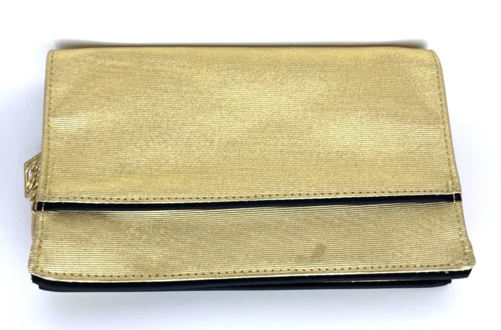 This shimmering gold clutch tells a story of elegance, with its sleek zipper design and logo charm. A radiant companion for refined outings. • Gold-tone zipper with decorative logo charm • Two compartments for organized storage • Compact size for easy carrying • Approx. dimensions: 9" x 6" • Durable fabric construction Minor scuffs on the gold surface, adding character. Measurements: Approx. 9 inches wide, 6 inches tall. Condition: Pre-Owned Like New