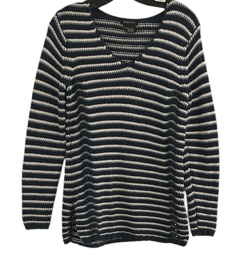 Excellent condition 100% cotton Split sides Dark Blue, light blue, white horizontal stripes, and two wider vertical stripes in each side Measurements pictured I offer quick careful shipping. Always happy to answer questions.