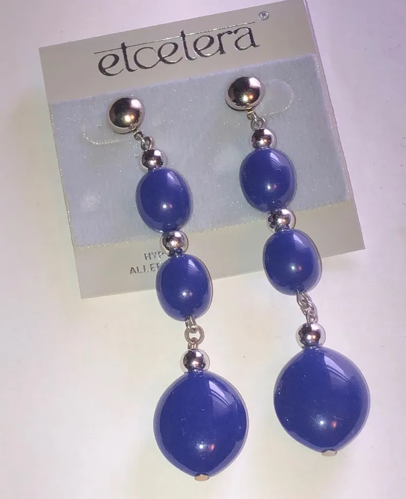 Elegant blue dangle earrings by Etcetera, perfect for adding a pop of color to any outfit. Features a sleek design with a touch of sophistication. New Approximately 4” long A8 Boho Vintage Street Style Minimalist Statement Piece Essential Trendy Fashion Forward Must-Have On-Trend Cute Casual Edgy Classic Rare Find retro mid century modern estate jewelry costume jewelry