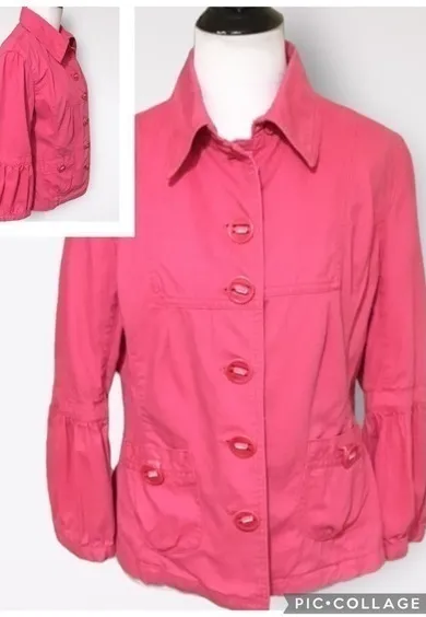 Etcetera pink tailored jacket. Large pink button with velvet bands. 2 button pockets on front. Pretty detailed sleeves LIKE NEW 100% cotton Dry clean Size 8 Approx measurements laying flat 19” armpit to armpit 21” shoulder to hem