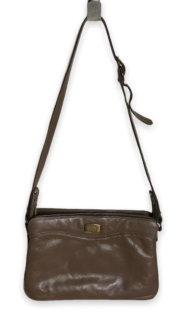 Etienne Aigner Taupe Brown Shoulder Bag Accordian Purse Lots of Pockets GENERALLY SHIP SAME OR NEXT DAY FROM FLORIDA!!! Nice leather bag from Aigner. Please note some light wear but overall a very nice bag as you would expect for the brand. Adjustable shoulder strap. Full top zipper goes up the strap on each side a little way. Please note some edge wear. Three main pockets. One is just a slip pocket, one is the zippered portion and it contains four pockets, the third is a snap closed pocket.