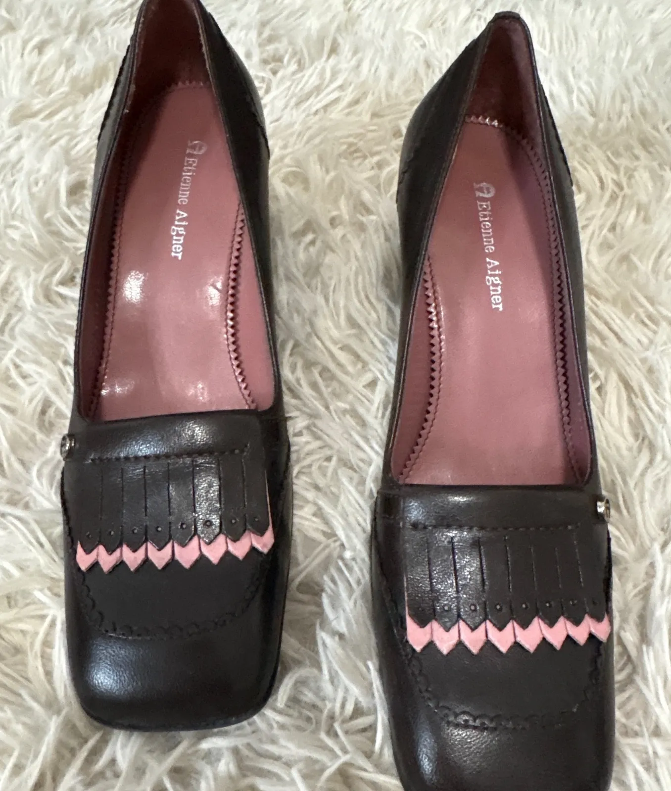 Elevate your look with these sophisticated Etienne Aigner pumps. These dark brown leather heels feature a chic square toe and stylish fringe detailing with a subtle pink accent, adding a touch of playful elegance to any outfit. The comfortable block heel provides all-day wearability, making them perfect for a day at the office or a stylish evening out. Worn once Department: Women Upper Material: Leather Heel Style: Block Type: Heel Toe Shape: Square Toe Pattern: Solid Heel Height: High (3-3.9 in) Closure: Slip On Features: Lined, Buckle Insole Material: Leather Outsole Material: Man Made Sole Lining Material: Leather Shoe Width: Standard Accents: Fringe, Logo Keywords: Etienne Aigner, dark brown pumps, leather heels, square toe shoes, fringe detail, block heel, women's fashion, dress shoes, work heels, evening shoes, classic style, sophisticated, elegant footwear
