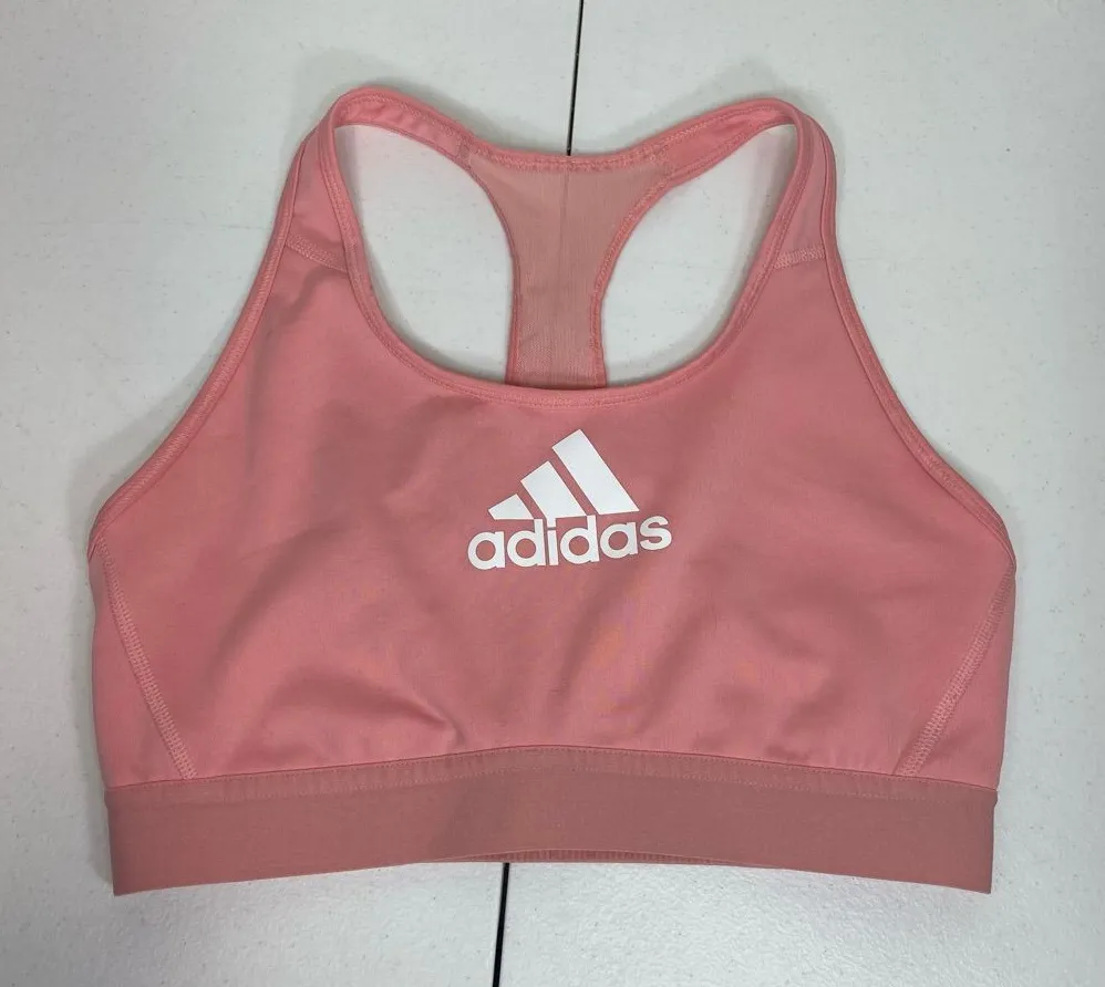 Adidas women’s light pink logo decal racerback mesh high support sports bra No padding Size tag mis... Show more
