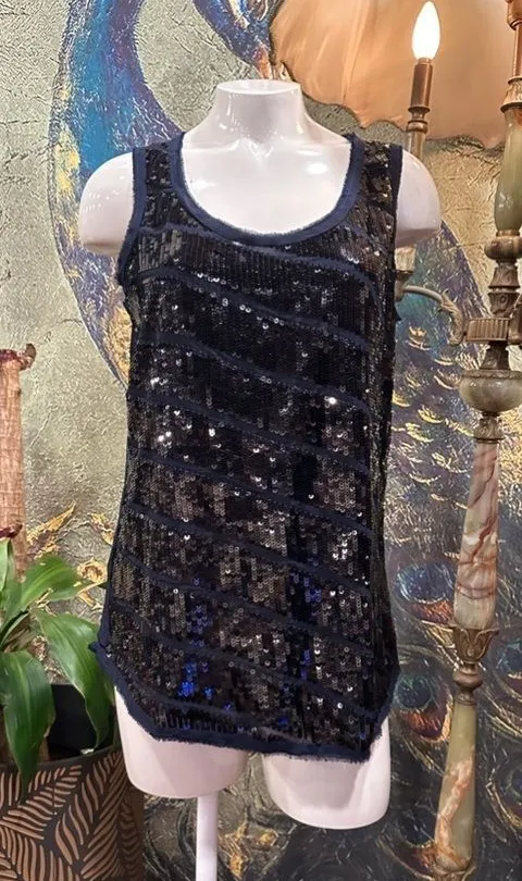 EUC Ann Taylor Loft Dark Navy Midnight Blue Sequin Blouse Wide tank top Sz M